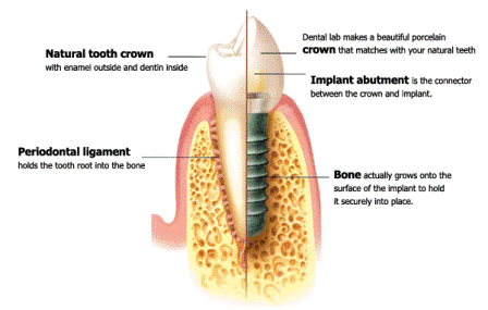 What are Dental Implants? Dental implants are an effective and lasting alternative to missing teeth, dentures and bridgework. Dr. Baker plans, places and maintains dental implants. The American Academy of Periodontology provides the following information about dental implants. You can schedule a brief consultation with Dr. Baker to determine if you are a candidate for implants. A dental implant is an artificial tooth root that a periodontist places into your jaw to hold a replacement tooth or bridge. Dental implants are an ideal option for people in good general oral health who have lost a tooth or teeth due to periodontal disease, an injury, or some other reason.